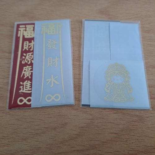 福宙貼紙:於廟裡向媽祖稟報>過爐後可貼於手機、辦公桌、無事牌(配掛於胸前);祈福發財水貼於水壼。