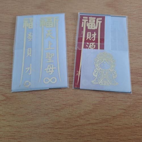 福宙貼紙:於廟裡向媽祖稟報>過爐後可貼於手機、辦公桌、無事牌(配掛於胸前);祈福發財水貼於水壼。