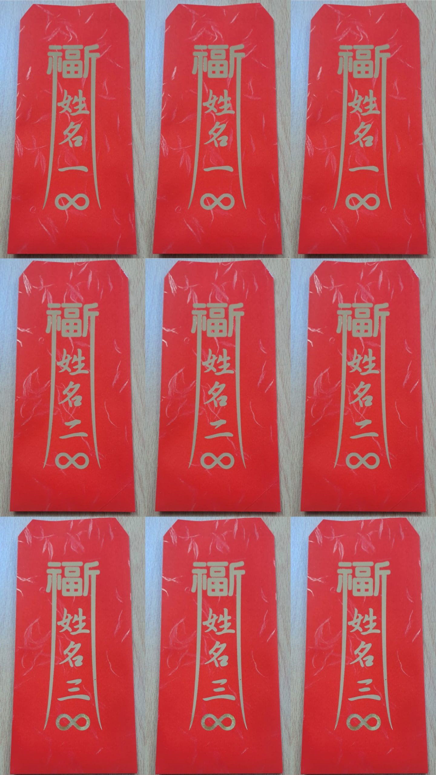 訂購500組(含)以上,贈送客製化姓名燙金福宙祈福招財紅包袋。三位人名 x 三個紅包袋:共九個福宙紅包袋